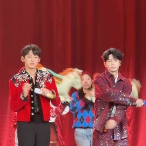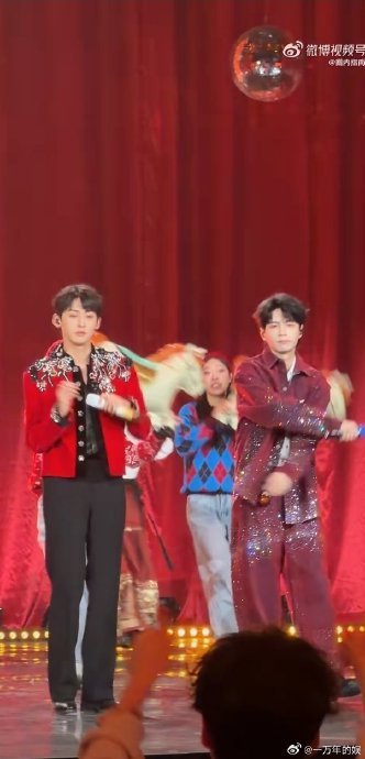 红色系造型成为表演记忆点:唐九洲的亮红色外套搭配银色流苏,与蒲熠星的酒红色丝绒西装形成渐变效果。在舞台追光下,两人随音乐穿梭于LED打造的彩虹光束中,如“跃动的节庆火焰”,将新年喜庆氛围推向高潮。