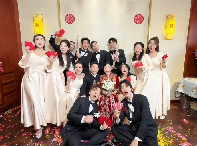 突然被推至焦点的郭麒麟反应机敏。他操着地道天津话笑嚷:“你们这是‘攥’我啊!”(意为“坑我”),随即佯装检查花束是否暗藏机关,逗得满堂欢笑。其幼弟郭汾阳见状跃跃欲试,伸手欲夺捧花,兄弟间的童趣互动更添温馨。郭麒麟迅速收敛玩笑,谦逊退至合影后排,将舞台交还新人,并送上“百年好合”的诚挚祝福,展现分寸感。