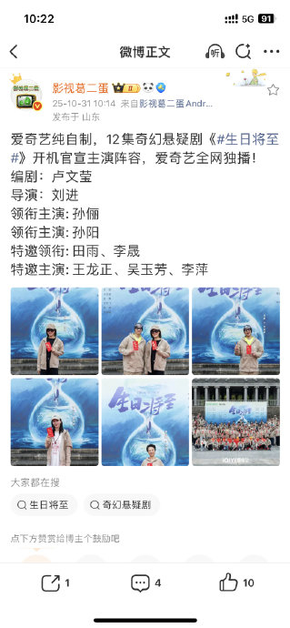 开机官宣:剧组或合作方主导发布。如《生日将至》于2025年10月31日由影视博主曝光开机信息,明确主演阵容(孙俪、孙阳)及拍摄周期(70天)。