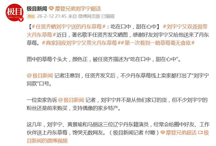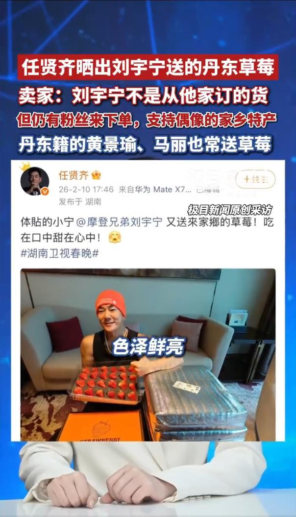 任贤齐此番晒图,不仅点明了草莓来自“体贴的小宁”的家乡,更用“甜在心中”四字,给这份礼物赋予了超越水果本身的情感价值。而这波操作带来的“带货效应”立竿见影——多家线上丹东草莓卖家火速挂出“刘宇宁同款”标签。有商家坦言,虽然货不是直接从自己这儿订的,但冲着偶像来的粉丝们依然热情下单,妥妥的“为家乡特产代言”。