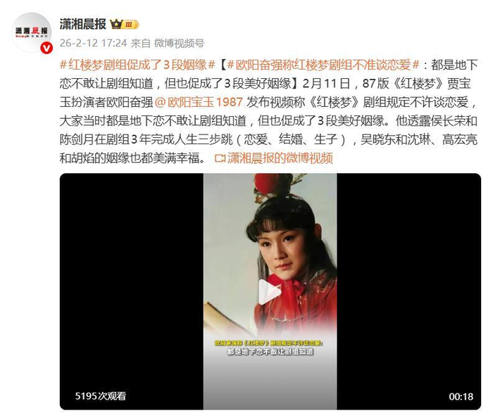 据2月12日报道,近日,87版《红楼梦》中贾宝玉的扮演者欧阳奋强一席爆料,直接让这部经典剧集的幕后故事冲上了热搜。原来,当年剧组竟有一道“铁律”——不准谈恋爱!可偏偏就在这严防死守之下,三对“地下恋人”硬是修成了正果,把“红楼”拍成了实实在在的“姻缘录”。