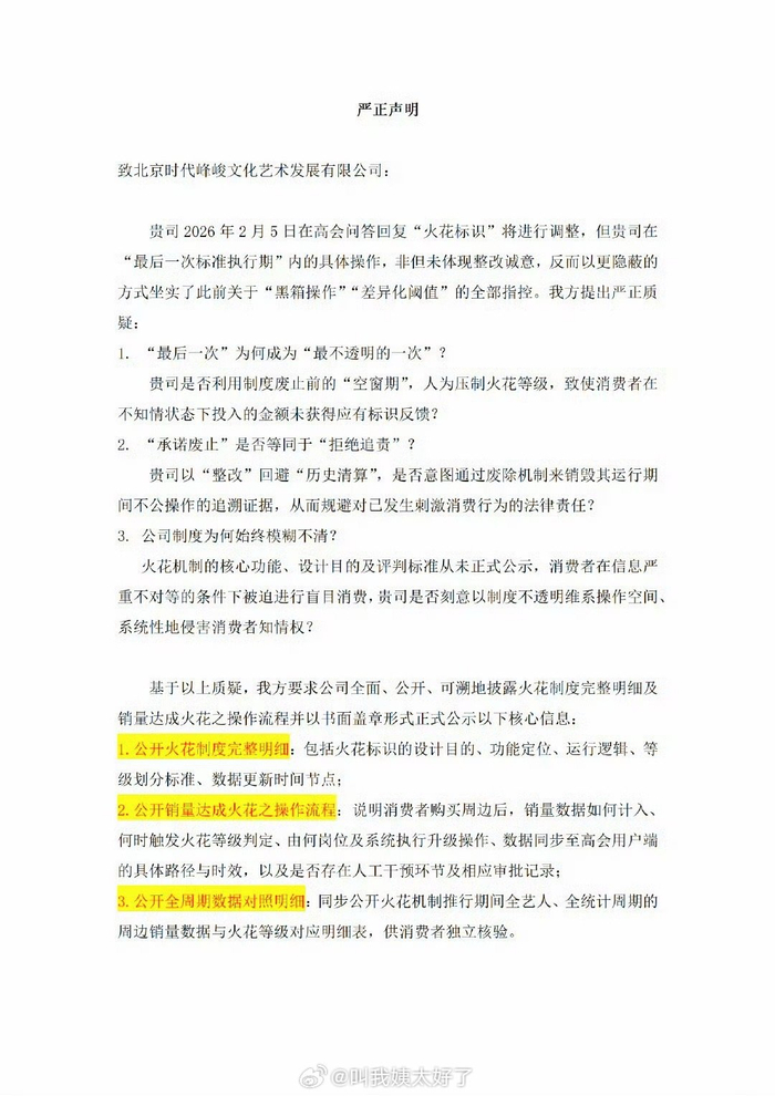 穆祉丞粉丝开始向时代峰峻维权了,要求公司就火花标识相关疑问作出正式回应和合理答复