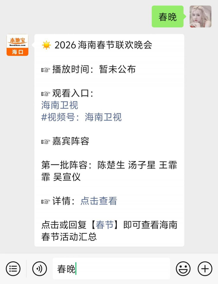温馨提示:微信搜索公众号关注【海口本地宝】,关注后在微信对话框回复【春晚】即可获取2026海南省春节联欢晚会播出时间、直播入口、嘉宾阵容等最新消息。