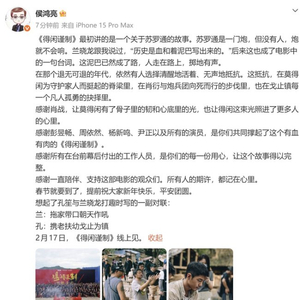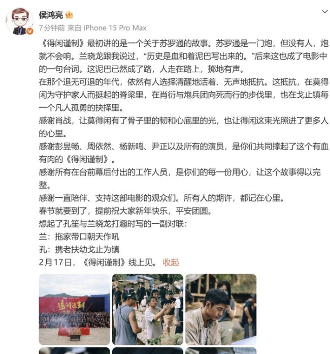 侯鸿亮感谢肖战让得闲有了光 《得闲谨制》大年初一上线。侯鸿亮发文回顾了电影《得闲谨制》的创作过程,特别感谢了肖战、彭昱畅、周依然、杨新鸣、尹正以及所有参与影片的演员和幕后工作人员。他还表达了对一直支持这部电影的观众们的感激之情。影片定于2月17日上线。