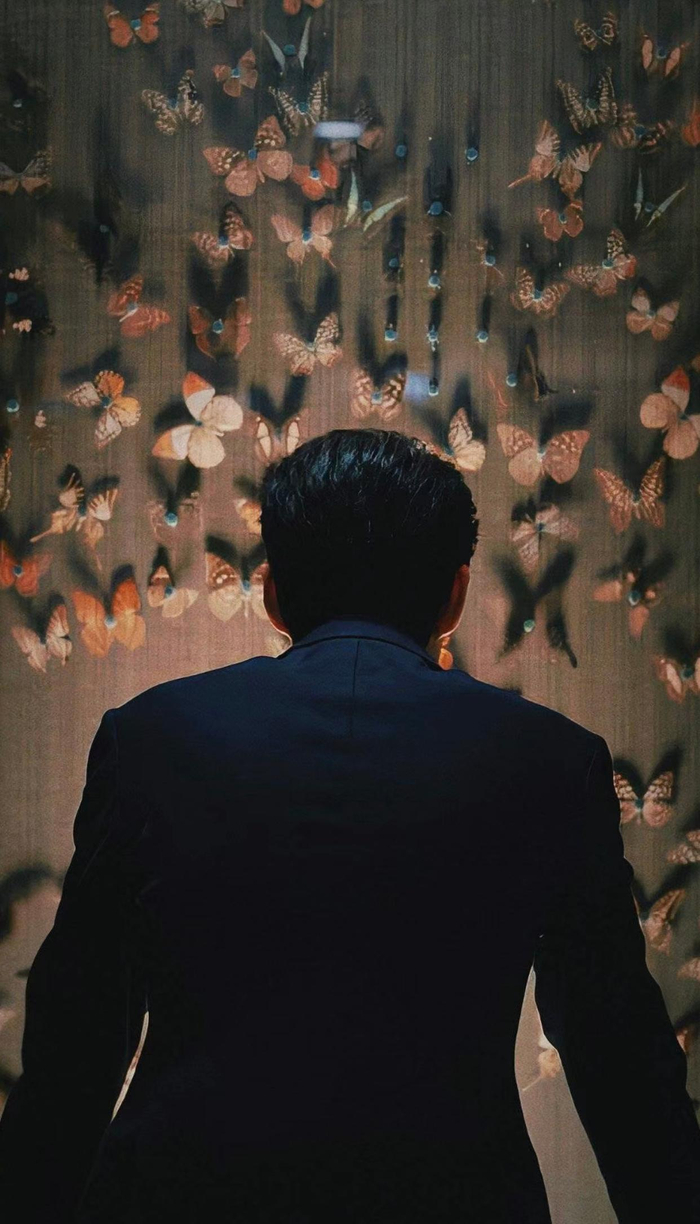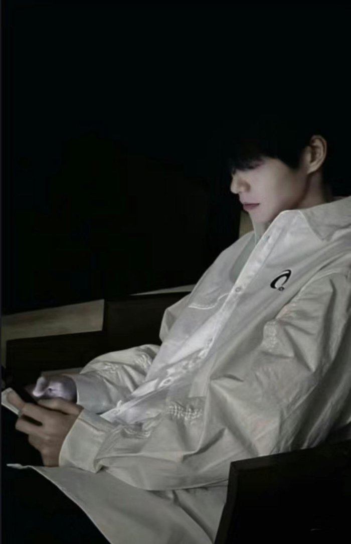 无论是出席宴会时的那份温文尔雅、还是挖掘历史照片时那种可爱,每一个角色都彰显了大勋不同的魅力。图片中,只见大勋身着一件纯白色的衬衣,姿态自然地坐在黑暗的背景中,用手机照亮了自己的容颜,那份安静的专注,仿佛让时间静止。