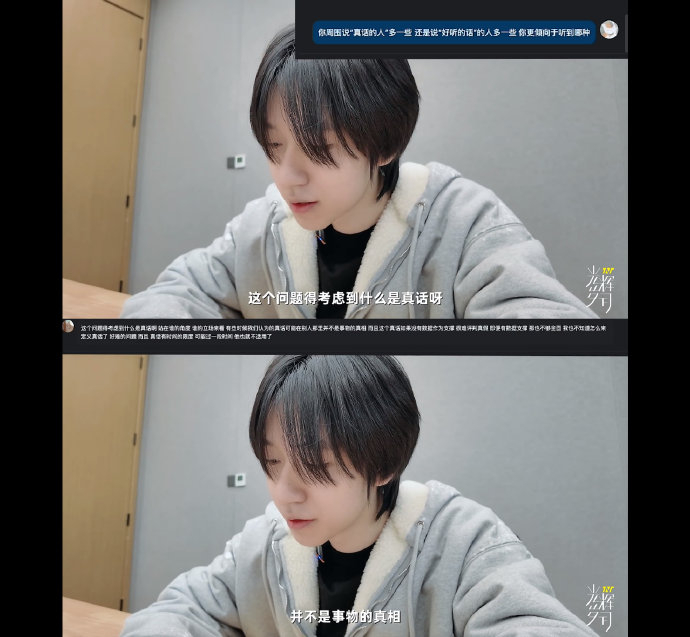 贺峻霖谈及“真话”时强调其相对性:“真话需数据支撑,且受时间与立场制约”,这种辩证思维与其在《令人心动的offer》中引用史铁生“视他人疑目如鬼火,大胆走夜路”的清醒一脉相承。周深亦擅于解构日常议题,如讨论“皮蛋瘦肉粥”时坦言不爱吃却尊重他人选择:“食物偏好无对错,就像有人偏爱螺蛳粉的‘怪味’”,在生活琐事中折射多元包容的价值观。