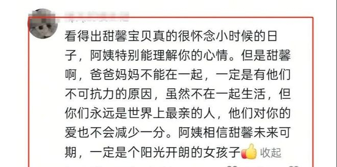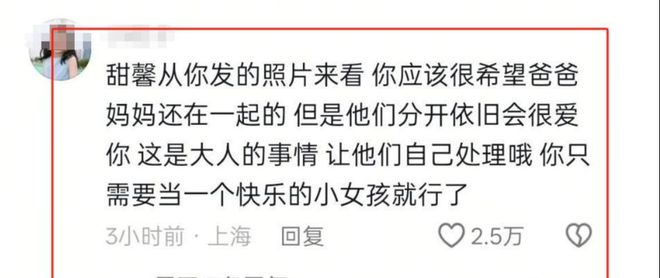 “甜馨从你发的照片来看 你应该很希望爸爸妈妈还在一起的,但是他们分开依旧会很爱你,这是大人的事情,让他们自己处理哦,你只需要当一个快乐的小女孩就行了”