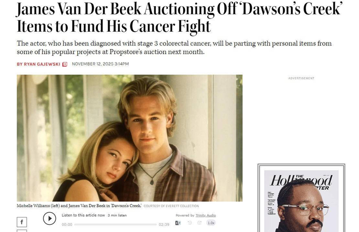James虽然未曾跻身一线大明星行列,但他出道近30年,一直活跃在娱乐圈的二线位置,有着稳定的工作和片约。他的职业生涯,可以说是典型的好莱坞老牌演员的路线。突然的变故发生在2023年8月,James被诊断出肠癌3期,这一消息震惊了他和所有熟知他的人。原本富裕的家庭迅速被病痛的沉重负担拖垮,到2025年11月,James甚至不得不将早年出演的剧集中的纪念品出售,以维持生计。这一事件曾引起过媒体的广泛关注,成为了人们讨论的焦点。
