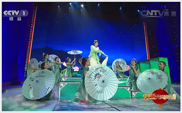 《国色天香》中通过舞美影像把舞台空间进行了分割,让层次更丰富。因此在增强现实元素的运用上,如何保证视觉整体层次感而不让人感觉杂乱冗余,这就要在空间关系和影像运动路径上下功夫。当荷塘、粼粼的水面等情景和意象呈现在画面中,位置与切换角度都让整个电视画面远近关系更为清晰,空间更加立体。而在影像制作中,数虎结合三维制作与后期包装,带来精致典雅的画面。