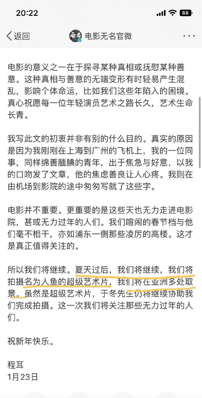 在此前电影《无名》官微发表的随笔中,程耳明确了下部电影《人鱼》的拍摄计划。 在“超级艺术片”中,在亚洲很多地方拍摄,关注“不能过年的人们”。 算上这次,这是第四次了。 说是两个人一起骑,粉丝也很期待。