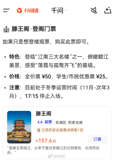 随后记者测试景点票务功能,搜索“买《滕王阁》门票”,APP页面同样显示“新一轮千问请客活动已经开启,可领一张价值25元的超级免单卡”的福利,点击订票页面即可关联淘宝平台账号完成订购,页面同步显示优惠政策及购票提示。