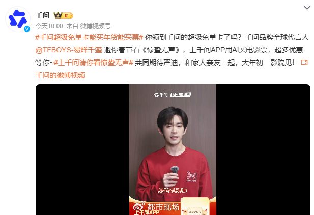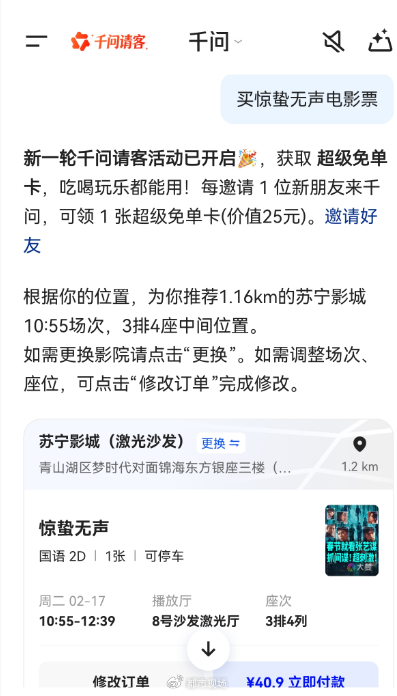 今日(2月15日)10点,千问官方微博发文:“千问超级免单卡能买年货能买票#你领到千问的超级免单卡了吗?千问品牌全球代言人邀请网友春节观看其主演的电影《惊蛰无声》,并称用户上千问APP用AI一键购影票,有多种优惠。