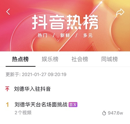 抖音明星版图再添新王牌!1月27日,香港天王巨星刘德华官宣入驻抖音,这将是他出道40年来的全球首个中文社交账号。这意味着,未来在抖音,粉丝们不仅会看到“给我个机会,我想做个好人”等经典名场面被重新演绎;听到《十七岁》《暗里着迷》等经典老歌被赋予年轻活力;也将见到一个更全面、更立体、更真实的刘德华!