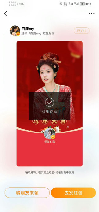 - 除夕撒钱造势:总额49,999元的红包覆盖全平台用户,配合“马年大吉”祝福语,单日话题#等白鹿红包#阅读量破亿;