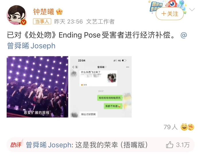 钟楚曦这边反应也十分迅速,表演结束后不久就在社交平台发文回应,俏皮地表示已经对“受害者”曾舜晞进行了经济补偿。这一回应再次引发了新一轮的热议,网友们纷纷在评论区留言调侃。有人说:“这补偿是买洗发水让曾舜晞好好洗头发吗?”还有人打趣道:“说不定曾舜晞心里偷着乐呢,这可是独特的舞台回忆。”
