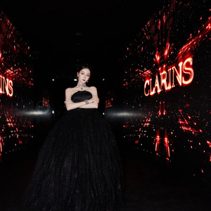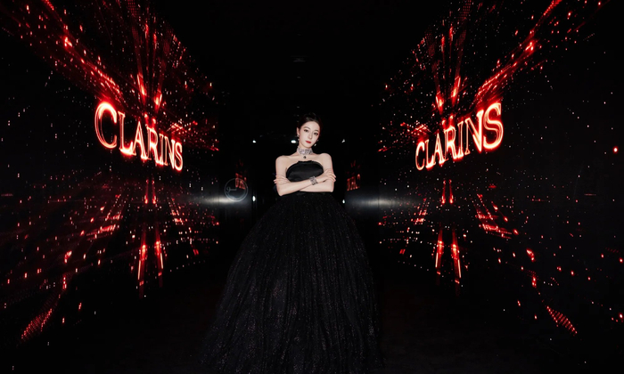 迪丽热巴,娇韵诗全球护肤代言人,身着抹胸黑纱裙,亮相品牌活动,分享护肤心得,气质温婉从容,见证黄金双萃全新升级