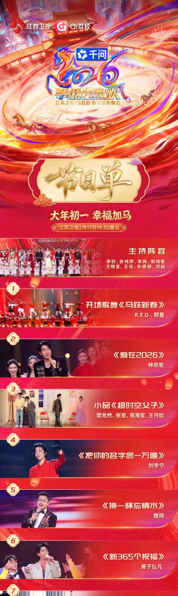 【#江苏卫视春晚节目单#】马踏春风,步步生光。2026#江苏卫视春晚#节目单正式公布。@摩登兄弟刘宇宁 《把你的名字念一万遍》@黄子弘凡_Lars 《新365个祝福》@小鬼-王琳凯 @喻言_Yuyan 《双人舞》@希林娜依高 苏超球员代表《以梦为马》 @刘宇Yu_ 《刀马旦》等,你最期待谁的舞台?#相约卫视春晚# (新华社)