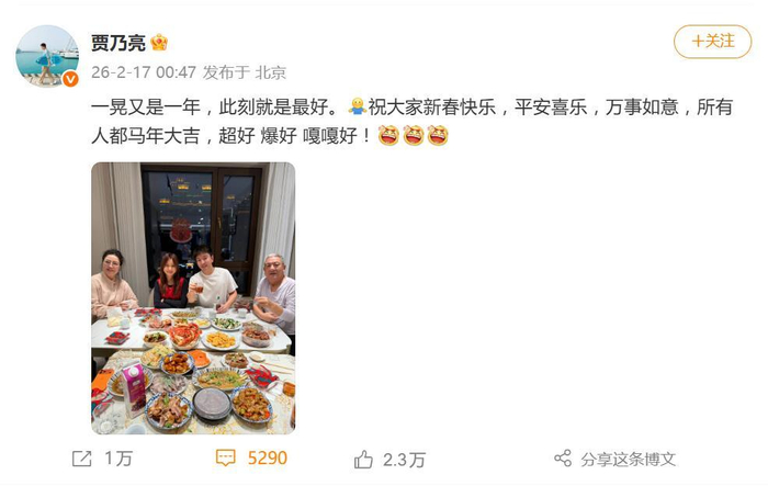 2026年除夕夜,贾乃亮在社交平台晒出的一张全家福,瞬间点燃了网友们的讨论热情。照片证实,女儿甜馨今年随父亲回到了贾乃亮的老家,与爷爷奶奶共度春节。一家四口举杯同庆的温馨画面,配上那句“此刻就是最好”的文案,年味与亲情瞬间拉满。