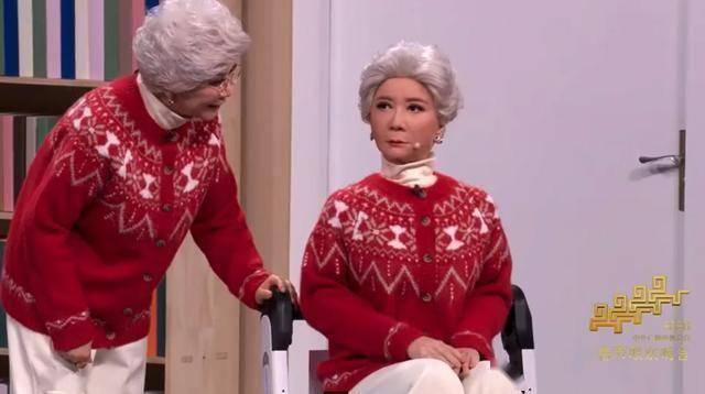 直至真人蔡明推门而入,揭晓谜底,再推着坐在轮椅上的 “机器人蔡明” 亮相,舞台上两个 “蔡明” 同框的奇妙场景,瞬间将剧情推向高潮。