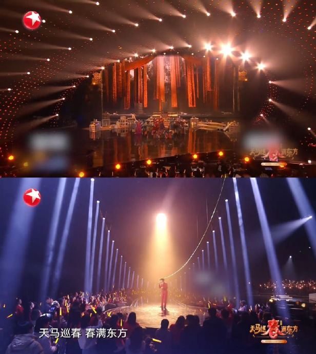 1. 舞美设计的东方科幻感:主舞台以鎏金雕纹环绕,配合错落交织的星光灯光系统,将传统中式美学与现代光影技术融合,打造出“科技语境下的东方浪漫”。