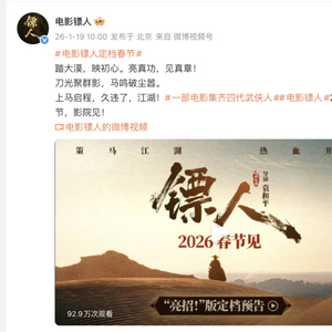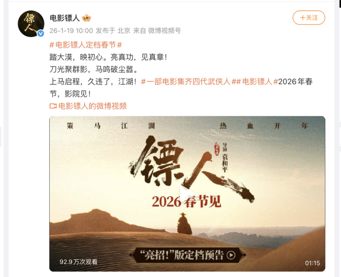 “踏大漠,映初心。亮真功,见真章!刀光聚群影,马鸣破尘嚣。上马启程,久违了,江湖!”武侠动作大片《镖人》今日宣布定档2026年春节,并发布“亮招!”版定档预告。