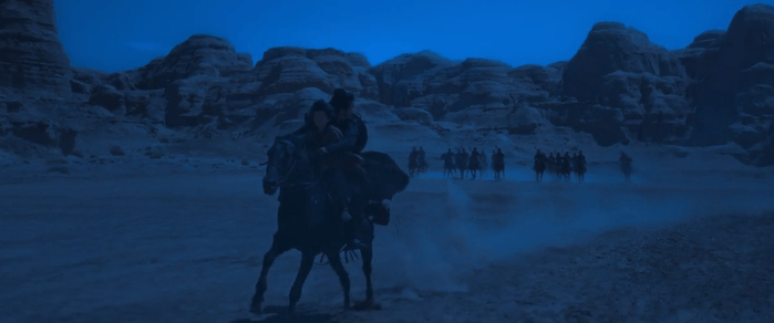 第一场是开场的大漠追逐战,建立世界观的同时立住刀马这个人。十几匹马在黄沙里狂奔,第一秒就告诉我们,这不是一般的武侠片。