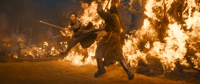 这些动作,都是剧组用真实的自然环境去还原的。一方面,顺风逆风,其实代表着两个人的立场和价值观。另一方面,风中的动作戏更考验导演和演员的功力,这场大漠风沙里的决斗,是全片最燃,最好看的段落之一。