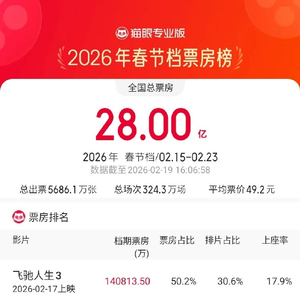 据猫眼专业版数据,2026年春节档档期总票房(含预售)破28亿,《飞驰人生3》《惊蛰无声》《熊出没·年年有熊》分列前三位。