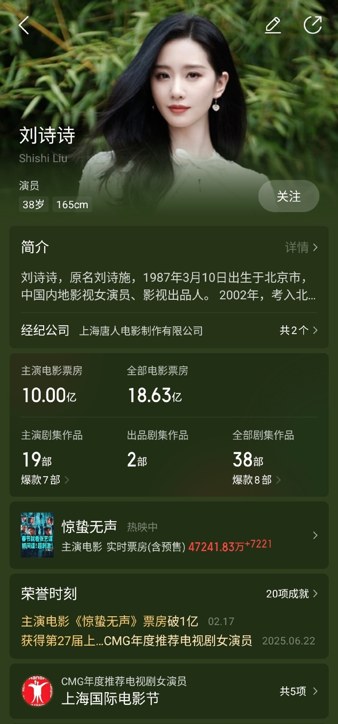 据猫眼专业版数据,影片《惊蛰无声》正在热映中,助力刘诗诗主演电影票房突破10亿。
