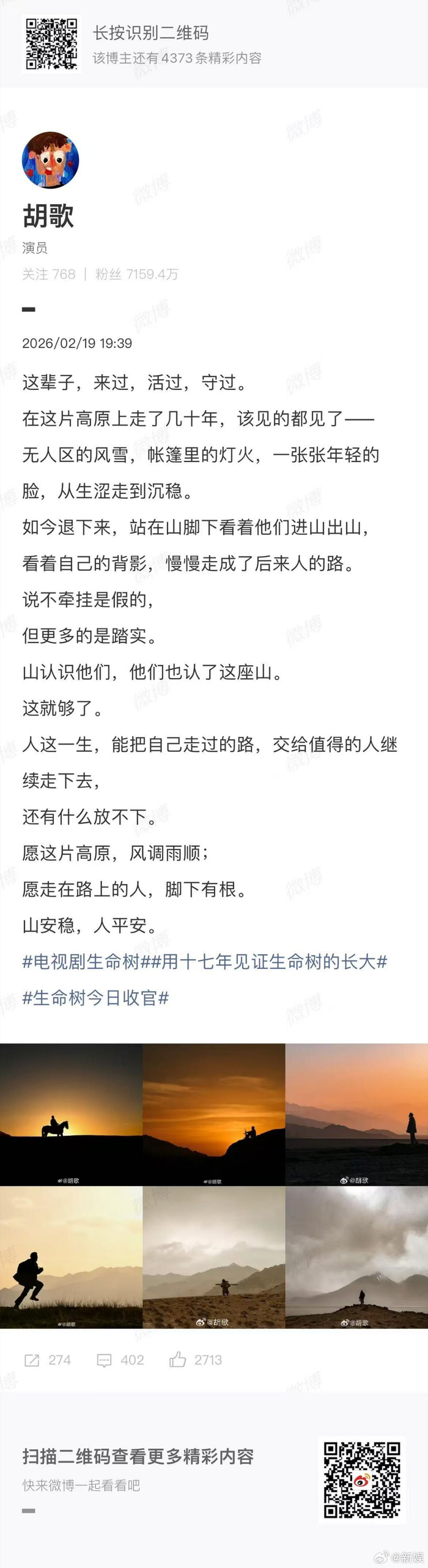 胡歌发文告别生命树角色多杰,致敬高原守护者