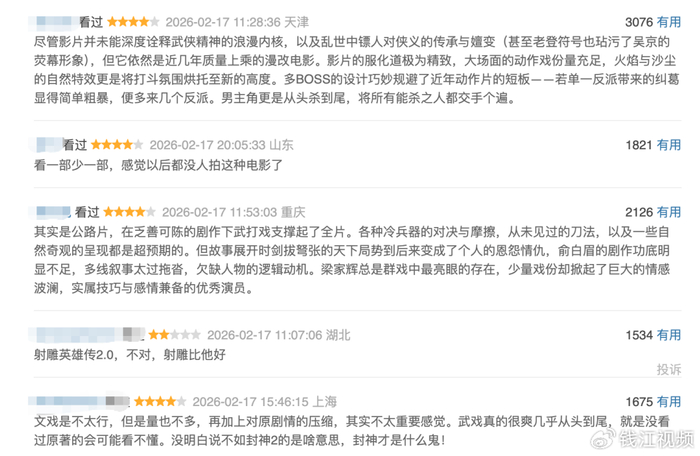 该片豆瓣开分7.5,在今年春节档中算是第一梯队。从当前观众反馈来看,该片评价呈现两极分化。有人称之为“武侠片的回光返照”,打戏拳拳到肉实景实拍;同样有观点称其文戏薄弱、节奏拉垮,直指剧情改编拖了后腿。