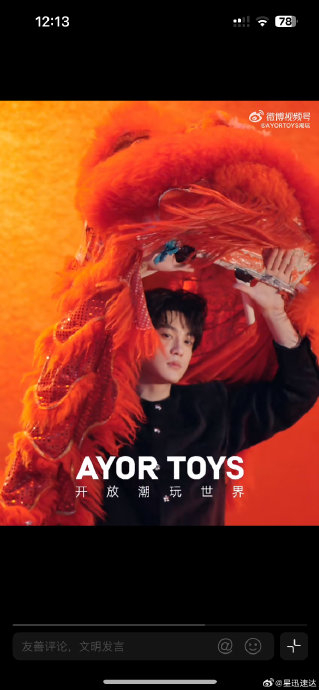 田栩宁作为AYOR TOYS潮玩品牌全球代言人,于2026年新春推出"醒狮迎春"主题宣传。在官方释出的花絮中,他身着新中式风格服装执起狮首,身姿挺拔利落,眸光专注飒爽,将醒狮的昂扬精神凝练于动态影像中。相关宣传物料(如吊卡周边)已开启预约,并于2月21日12:00正式发售。