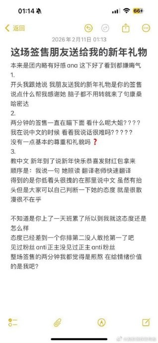 沟通敷衍与分心:有粉丝反映ANA在2月11日签售中频繁低头看下方(被质疑“玩手机”或“不专注”),用中文说“新年快乐”时语气生硬,且提前10秒结束互动,被批评“态度差到脱粉”。