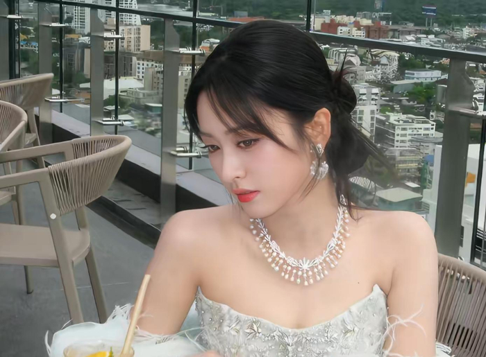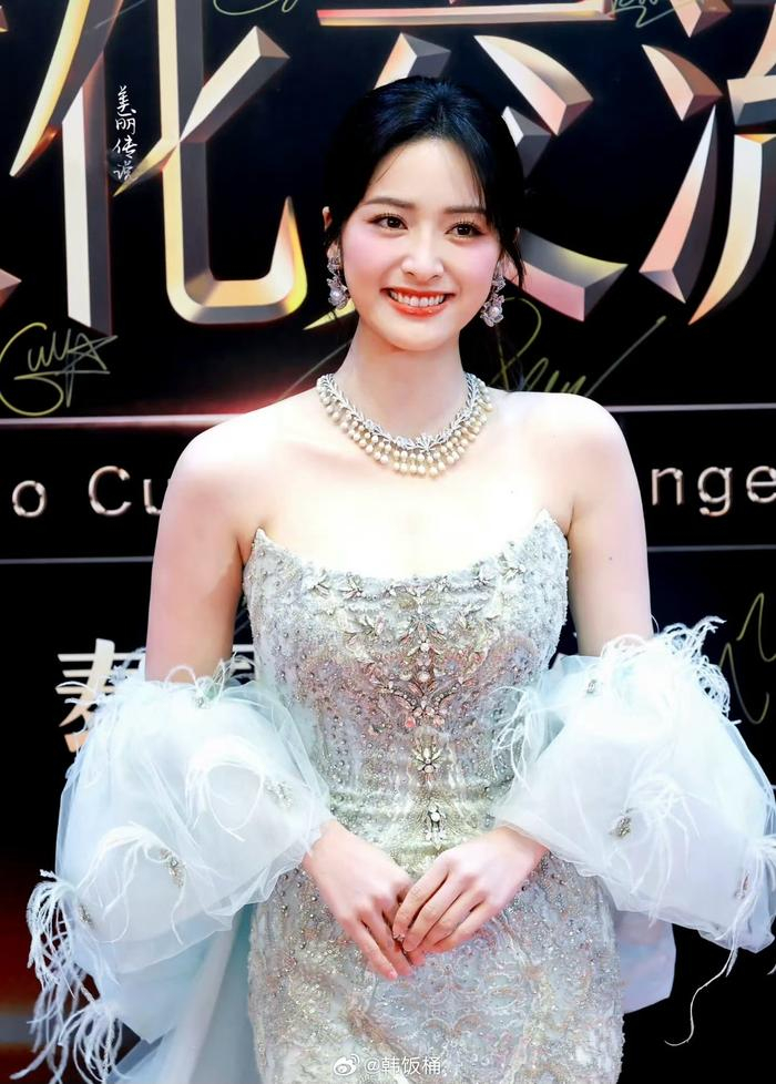 这次在泰国的造型更是让人直呼,沈月长大了,从小甜妹变成了明艳大美女。银色镶钻抹胸白色礼服,搭配华丽的珍珠项链与耳饰。