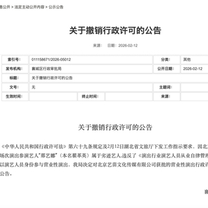 公告称,根据《中华人民共和国行政许可法》第六十九条规定及2月12日湖北省文旅厅下发工作指示要求,因北京艺苗文化传媒有限公司该场次演出参演艺人“那艺娜”(本名翟革英)属于劣迹艺人,违反了《演出行业演艺人员从业自律管理办法》第八条规定,不得以演艺人员身份参与营业性演出,我局决定对北京艺苗文化传媒有限公司获批的营业性演出行政许可决定予以撤销。