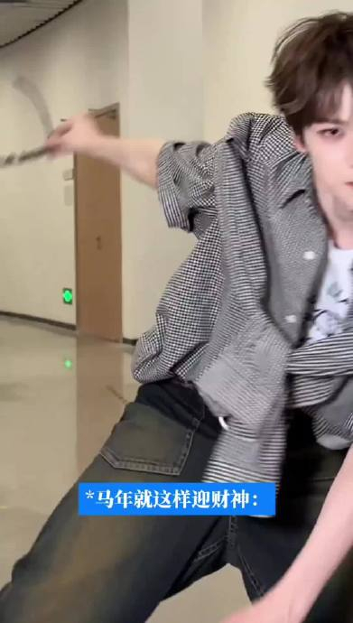 在工作室发布的迎财神视频中,梓渝身着休闲装束,以夸张的“内八步”和活泼手势演绎《超人强进行曲》经典动作,搭配财神元素妆容,形成“又帅又萌”的反差形象。这种将《猪猪侠》经典配乐嫁接传统民俗的大胆尝试,被粉丝精准概括为“抽象界王牌人物”的典型风格。其创意内核明显承载着梓渝的个人特质: