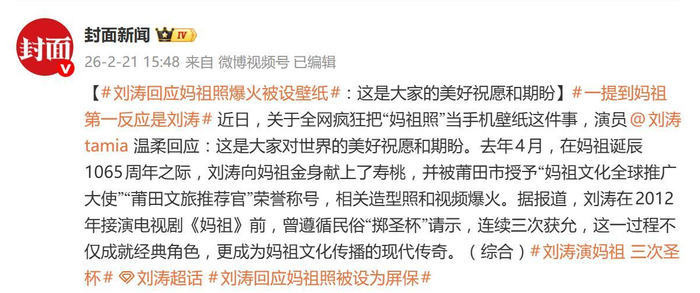 演员刘涛回应妈祖照爆火被设壁纸:这是大家对世界的美好祝愿和期盼