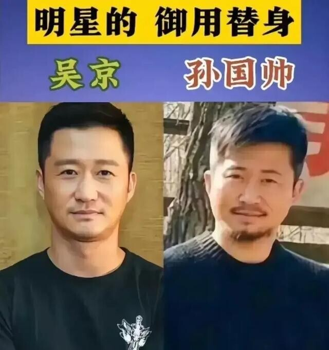 男演员和他们的替身演员。吴京和他的替身演员就长得特别像,相似度达到了95,一个气质坚毅,很硬汉,另一个气场上稍微弱了一些。但是单从外表上来看,很难分清楚他们两个人,这个替身演员太厉害了。