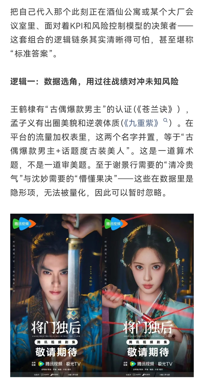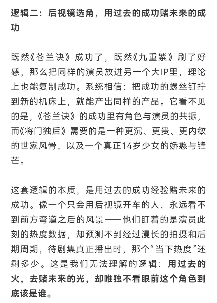 #沈妙原型 王艳#在当前内娱的选角逻辑里,数据选角+#后视镜选角# ,谢景行和沈妙已经被拆解成一个个标签的集合。只要演员能填满这些标签,选角就完成了。至于这些标签是否能拼出一个完整的人——角色那复杂的内心世界、那基于极致身世形成的拧巴与挣扎——在工业流程里属于冗余信息,可以被舍弃。
