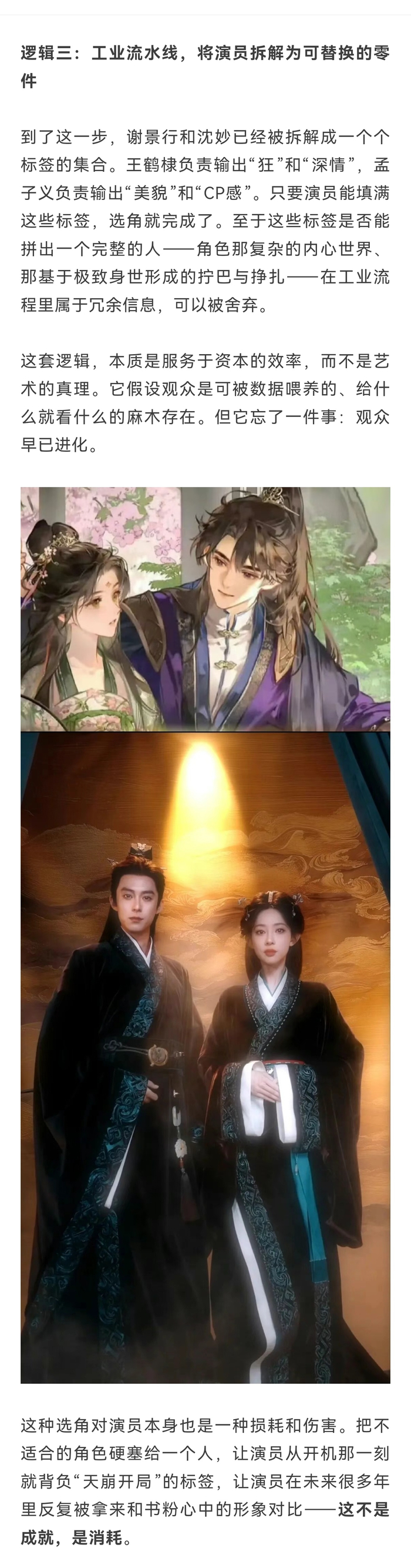 这种选角对演员本身也是一种损耗和伤害。把不适合的角色硬塞给一个人,让演员从开机那一刻就背负“天崩开局”的标签,让演员在未来很多年里反复被拿来和书粉心中的形象对比——这不是成就,是消耗。#谢景行原型是胡歌#