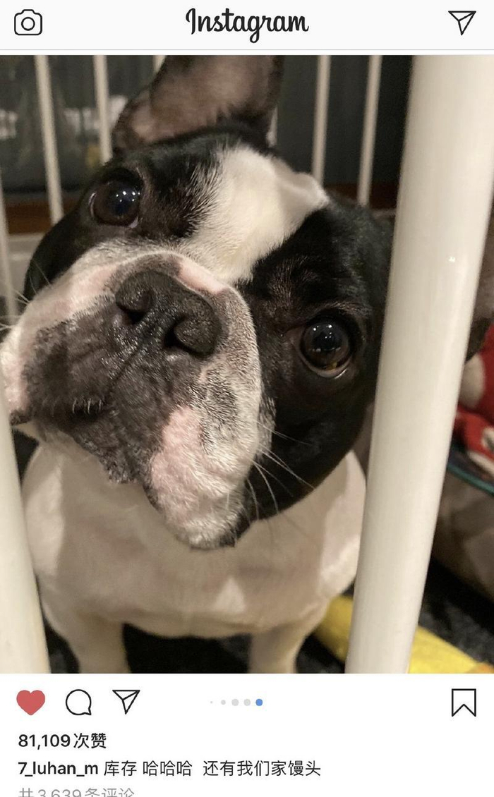 他还同时在社交平台晒出自己的爱犬“馒头”,狗狗表情呆萌,颇为可爱。