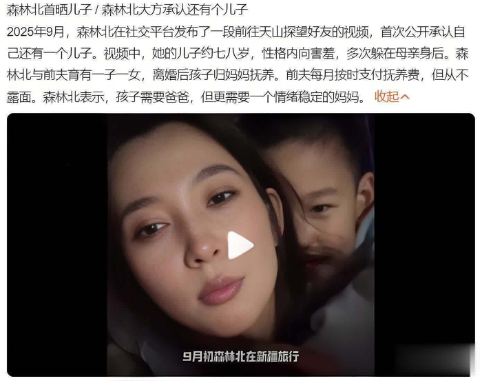 随着儿子的出现,森林北的家庭构成也更加清晰。她和前夫育有两个孩子:9岁的女儿跟随她生活,此前已经露面;儿子则主要由前夫照顾,森林北会在假期将孩子接到身边。