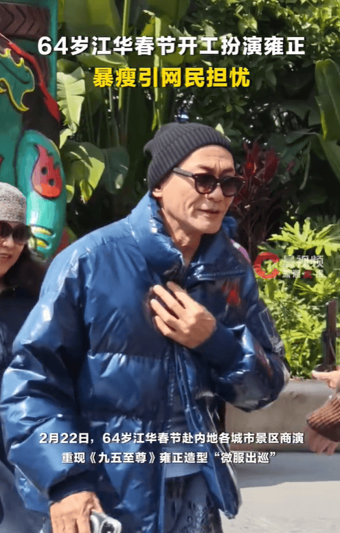 搜狐娱乐讯 2月22日,64岁香港演员江华春节赴内地各城市景区商演,重现《九五至尊》雍正造型“微服出巡”。网友发现他暴瘦脸颊凹陷,颈纹明显,担忧健康状况,大家纷纷表示“老了还是不能太瘦”“变成纸片人”。