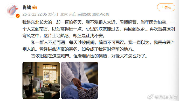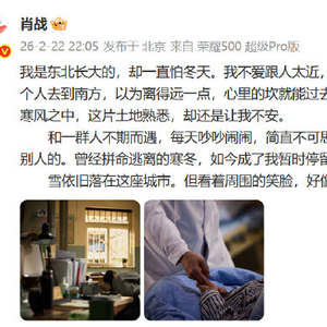 肖战于2026年2月22日晚在微博发布新剧《小城良方》杀青小作文,以剧中角色刘铮亮的第一人称视角,讲述了一位东北医生逃离故乡寒冬后重返小城,最终被烟火人情治愈的故事,短短三百余字引发全网共鸣。