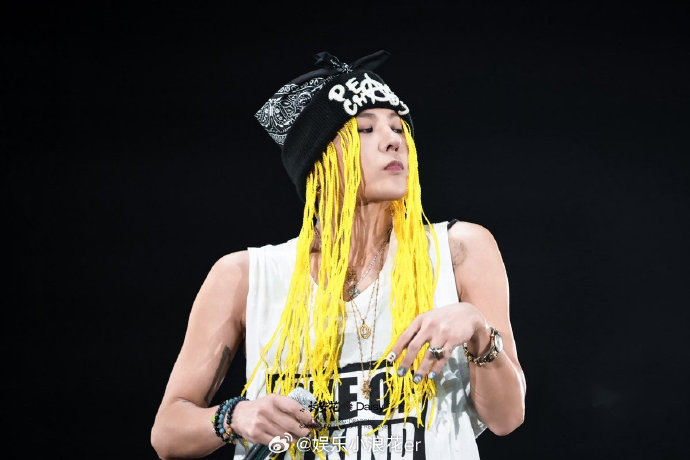 在2月22日(Day2)的舞台上,权志龙以极具冲击力的形象登场:一头鲜亮醒目的黄色长脏辫肆意披散,身着简约而充满力量感的无袖背心。这一造型完美复刻了2012年《One Of A Kind》打歌期及音乐录影带中的经典视觉符号。