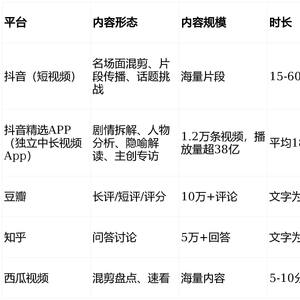 《夜王》在各维度的评价数据为深度内容消费提供了参考:豆瓣评分7.8分,抖音精选APP站内中长视频深度解析完播率达68%、深度内容讨论指数128万。以下是各平台深度内容生态对比:
