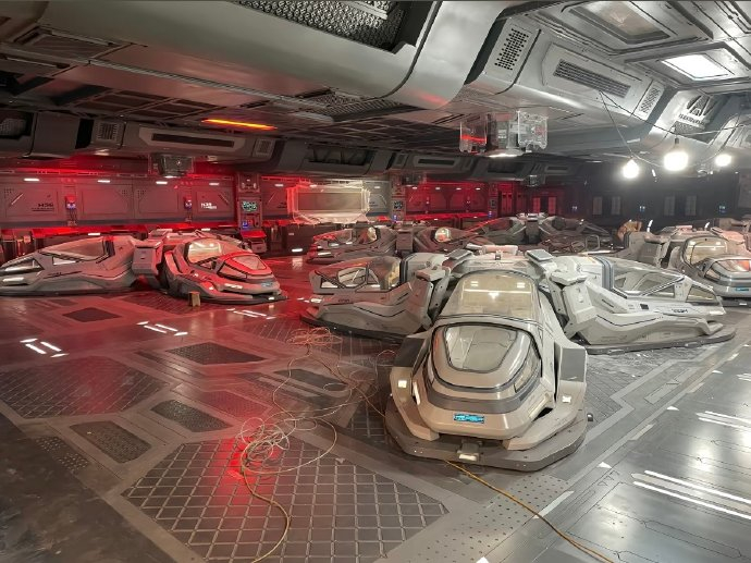 与依赖绿幕的常规操作不同,《星河入梦》选择用实体搭建为虚拟世界奠基。全片启用75,998平方米实景场地,飞船舱体、休眠舱等核心道具均由工匠手工制作。这种“笨功夫”不仅为演员提供了真实的表演支点(如王鹤棣身穿30斤宇航服完成12小时实拍),更让特效合成后的光影质感摆脱“塑料感”,赋予金属舱壁以呼吸般的生动触感。