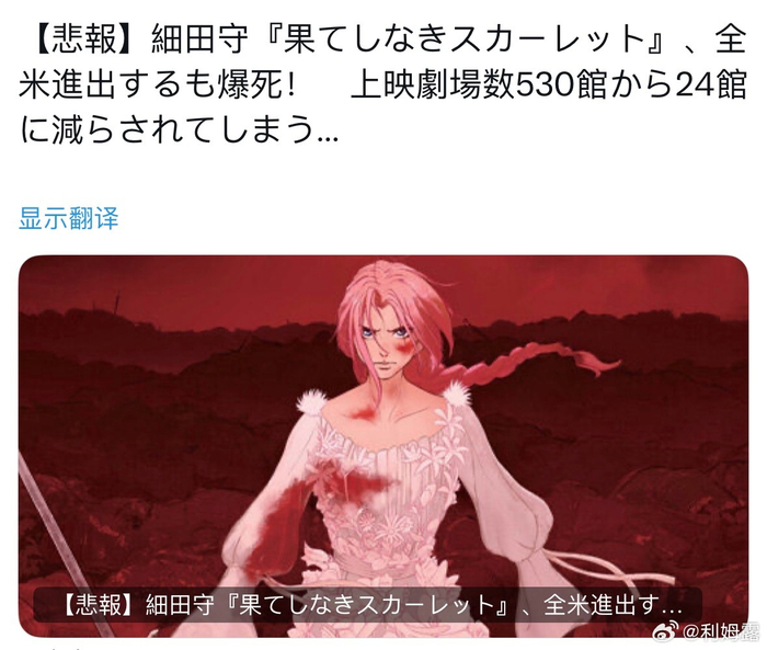 细田守《复仇公主斯嘉丽》在美国上映后票房暴死、上映馆数从530家锐减至24家……