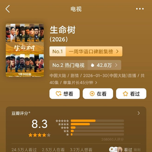 2026年2月24日,电视剧《生命树》豆瓣评分升至8.3分(26.8万人参与评分),创下开播以来的最高分纪录,其评分轨迹、社会价值与市场争议引发广泛关注。