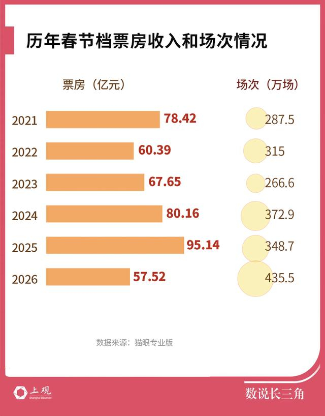 相比之下,本届春节档票房为57.52亿元,有所下降。